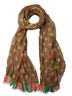 Милый палантин из мягкой ткани коричневого цвета, оформленный контрастным принтом "горошек", выборочно некоторые горошки покрашены в яркие оттенки, так же и края палантина имеют небольшие цветные полоски. Такой дизайн выглядит несколько по-детски, но очень красиво, он станет изюминкой вашего повседневного образа. Размер: 90х180 см.
