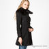 Женственное приталенное однобортное пальто. Широкий отложной воротник с отделкой искуственным мехом. Застежка на пуговицы. Рельефные швы декорированы атласным кантом.