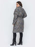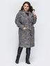 Серое пальто с накладными карманами на полочке. В изделии предусмотрена подкладка. Пояс в комплект не входит.