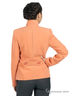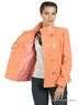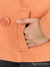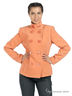 Укороченное двубортное пальто-френч. Стильный воротник-стойка. Рельефные швы спереди и сзади. Встречная складка сзади украшена декоративными строчками. Фигурный хлястик. Два кармана «листочка» спереди. Пастельный оранжевый цвет - модный и элегантный. Такой короткий двубортный френч прекрасно выглядит в комплекте с юбкой мини или узкими брюками.