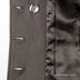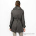 Крой пальто прямой, клиньями, линию талии подчеркивает неширокий ремешок с пряжкой. Пуговицы в два ряда серого цвета, в тон ткани пальто, выполняют так же декоративную функцию. Спереди два функциональных кармана-клапана с застежкой на пуговицы. Сзади разрез-шлица.