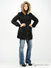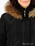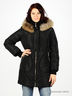 Воротник стойка из трикотажа. Съемный капюшон пристегивается по горловине на тесьму молнию. По переднему краю капюшона на тесьму молнию пристегивается опушка из натурального меха. По переднему краю капюшона продет шнур, выведенный через две блочки с ограничителем.