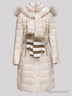 Опушка - натуральный мех ЕНОТА. Капюшон и мех отстегиваются. Шарф, заканчивающийся декоративными варежками, является продолжением капюшона и отстегивается вместе с ним. Рукава пальто с отворотом для регулировки длины и с трикотажными манжетами внутри