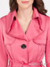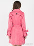Плащ прилегающего покроя с отрезной талией. Воротник классический-английский отложной. На полочках и спинке - кокетки, шлевки под пояс. Карманы втачные с планкой. По всей модели двойные строчки. Низ сшит клиньями. По низу рукав чуть расклешен, украшен закругленными краями, есть шлевки с пояском. Подкладка ткани сшита из яркой ткани с цветочной композицией. Изделие с поясом на талии и два пояска на рукавах.