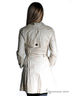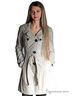Плащ прилегающего силуэта. Воротник отложной. Застежка на крупные черные пуговицы. На спинке и на полочках - кокетки. Спереди и сзади шлевки для пояса. Подкладка из ткани с фиолетовым принтом.