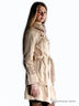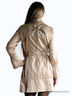 Плащ прилегающего покроя с поясом. Воротник стойка. На полочках и спинке кокетки закрепленные декоративными кнопками. Карманы втачные с планкой. По всей длине модели двойные строчки. По низу изделия идет кулиска в 15 см от края низа изделия, в нее продета резинка для регулировки сборки. На рукавах по низу (15 см от края рукава) идет сборка. Застежка на молнию закрыта декоративной планкой-сборкой. На планке идет 1 ряд кнопок. Подкладка ткани сшита из яркой ткани.