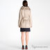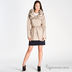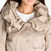 Легкое пальто из плащевого материала с металлическим блеском. Пальто на подкладочном материале, без утеплителя. Горловина оформлена круглым отложным воротником, который собран объемным воланом. Рукава прямого кроя. Застежка спереди на крупные пуговицы. Есть два функциональных прорезных кармана. Пальто приталивается широким завязывающимся поясом.