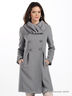 Детали: широкий отложной ворот со сборкой, двубортная застежка на пуговицах, пальто присборено по линии талии, два врезных кармана, рукав длинный прямой.