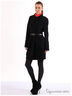 Женственный силуэт пальто подчеркивает грудь, талию и бедра одновременно: узкий, компактный верх с четким плечевым поясом и слегка преувеличенный объем в области бедер за счёт мягких складок от талии. В оформлении верхней части изделия угадываются нотки стиля милитари: погоны, скошенная линия борта, асимметричная стойка. Пуговицы и кожаный ремень подобраны в цвет пальто.