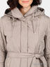 Детали: широкий отложной воротник, отстегивающийся капюшон на молнии и кулиске, длинные рукава, застегивается на молнию и кнопки, спереди 2 прорезных кармана на молнии, внутри прорезной карман на пуговице, талия подчеркнута поясом