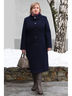 Пальто полуприлегающего силуэта декорировано фигурными рельефами и отстрочкой на полочке и спинке. Классический втачной рукав с подрезами по низу. Застежка-пуговицы. Воротник с застежкой на пуговицу. Длина ниже колена. Длина рукава: 64 см. Длина изделия: 110 см.