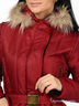 Детали: застежка на молнию и кнопки, капюшон с отстегивающимся мехом, два кармана с клапанами на кнопках, неэластичный пояс с пряжкой, два внутренних кармана на липучках