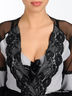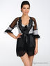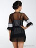 Элегантный женский пеньюар. Выполнен из тонкой сетчатой ткани, низ изделия из эластичной прозрачной ткани, на полочке и рукавах непрозрачные вставки. Рукав 3/4 дополнен манжетой в виде двойной оборки. Пристроченный пояс. Декорирован кружевными вставками.