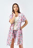 Комплект состоит из трех предметов: халат, шорты и майка. Нежный и очень красивый халат с поясом на запах и карманами. Шорты, входящие в состав комплекта, оригинального кроя на запах. Образ дополнен очень красивым принтом на майке.