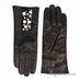 Зимние перчатки изготовлены из натуральной кожи ягненка чёрного цвета. Вставка из натуральной велюра, декорированная бусинами и блочками. Длина манжеты от нижней точки большого пальца до края перчаток составляет 7 см. Пальцы средние.