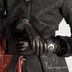 Гладкие перчатки из кожи ягненка. Украшены золотистой фурнитурой. С широким запястьем. Внутри выполнены из вязанной шерсти.