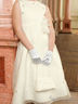 Элегантные короткие перчатки выполнены из атласной ткани. Область запястья декорирована лентами, стазами и изящными бантиками.