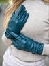 Перчатки кожаные женские демисезонные/зимние Venera бирюзового цвета. Перчатки из натуральной гладкой кожи на шерстяной подкладке. Длина перчатки классическая средняя. Манжета перчатки украшена стилизованным бантом из кожаного шнура. Перчатки сшиты внутренним машинным швом, подкладка с перчаткой сшита ручным швом.