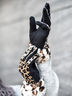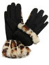 Женские трикотажные демисезонные перчатки из шерсти черного цвета с отделкой из велюра леопардовой расцветки по тыльной стороне ладони и мехом на запястье. Внутренний слой трикотажного полотна перчатки - длинноворсовый флис.