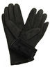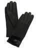 Женские трикотажные демисезонные перчатки черного цвета с меховой и кожаной вставкой и кожаной пуговицей на тыльной стороне запястья. Перчатки из полиэстера, имитирующего замшу. Внутренний слой трикотажного полотна перчатки - длинноворсовый флис.
