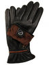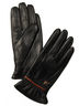 Женские перчатки из натуральной кожи. На тыльной стороне не большой металлический бантик и оранжевая вставка из кожи.