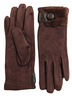 Женские трикотажные демисезонные перчатки коричневого цвета с меховой и кожаной вставкой и кожаной пуговицей на тыльной стороне запястья. Перчатки из полиэстера, имитирующего замшу. Внутренний слой трикотажного полотна перчатки - длинноворсовый флис.