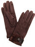 Женские трикотажные демисезонные перчатки коричневого цвета с меховой и кожаной вставкой и кожаной пуговицей на тыльной стороне запястья. Перчатки из полиэстера, имитирующего замшу. Внутренний слой трикотажного полотна перчатки - длинноворсовый флис.