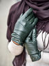 Перчатки кожаные женские демисезонные/зимние Venera темно-зеленого цвета. Перчатки из натуральной гладкой кожи на шерстяной подкладке. Длина перчатки классическая средняя. Манжета перчатки с разрезом для облегчения надевания перчатки на руку, декорирована металлическими блочками. На тыльной стороне - декоративная строчка. Перчатки сшиты внутренним машинным швом.