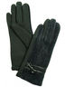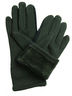 Женские трикотажные демисезонные перчатки из шерсти темно-зеленого цвета с отделкой из ворсовой ткани по тыльной стороне ладони и кожаными ремешками с бантиком на запястье. Внутренний слой трикотажного полотна перчатки - длинноворсовый флис.
