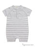 Удобный песочник машинной вязки из 100% хлопковой пряжи нежно-голубого цвета в полоску отлично подойдет Вашему ребенку. Модель имеет короткий рукав, застежку на пуговицы спереди и на 3 кнопки по шаговому шву.