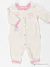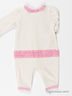 Нежный песочник для девочки. Округлый вырез горловины, длинные рукава. Снизу и спереди боди-застежка на кнопки. Модель украшена рюшами и оригинальной нашивкой.