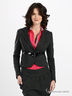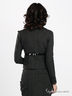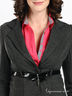 Приталенный трикотажный пиджак цвета темно-серый меланж. Отложной воротник с лацканами. Застегивается на пуговицу. Прекрасно сидит благодаря подкройным выточкам. Втачной пояс со шлевками. Два прорезных кармана, украшенных складками. В комплект входит лакированный ремень черного цвета.