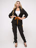 Женский пиджак Арлуно с отложным воротником и кулисой-утяжкой по линии талии. Украшают изделие яркие ленты и люверсы. Манжеты рукавов фиксируются кнопкой на шлевке. Есть накладные карманы с клапанами.