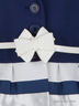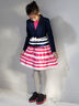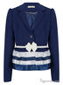 Стильный пиджак с отложным воротничком и застежкой на пуговицы. Снизу модель украшена контрастными атласными лентами. Заканчивает образ - лакированный ремешок, украшенный бантиком. Отличный выбор!