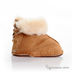 Бежевые детские пинетки с меховой оторочкой от UGGAustralia. Изнутри полностью выложены мехом. Подошва из плотного искусственного материала.