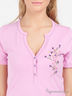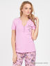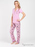 Детали: v-образный вырез горловины, застежка на пуговицы, короткий прямой рукав, брюки на резинке декорированы трикотажной лентой