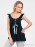 Детали: округлый вырез горловины декорирован оборкой, застежка на пуговицы, завышенная талия на кулиске, брюки на резинке с декоративной лентой