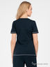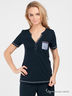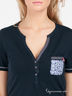 Детали: v-образный вырез горловины, застежка на пуговицы, короткий прямой рукав, декоративный кармашек, брюки на резинке декорированы трикотажной лентой