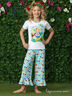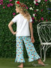Широкие штаны длинной 3/4, оригинального кроя, классической посадки на эластичном поясе запакованного типа, выполнены из яркого принтованного трикотажа “Лето в саду”. Отличная комбинация принтов-компаньонов, игривая стилистика воланов на штанишках и контрастная обработка деталей привлекает особое внимание к модели.