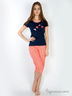 Домашняя трикотажная пижама. В комплект входят: футболка с короткими рукавами, округлый вырез, на полочке оригинальный принт, капри на резинке, с оригинальным принтом.