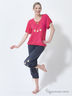 Пижама из тонкой трикотажной ткани, состоящая из футболки с коротким широким рукавом и из брюк на плотной резинке. Изделие декорировано аппликациями.