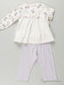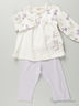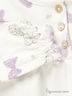 Лонгслив расклешенного силуэта выполнен из трикотажа средней плотности. Застежка на три пуговицы. Округлый вырез горловины, длинный рукав посажен на манжету с резинкой. Полочка украшена принтами и атласным бантиком.