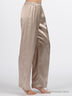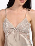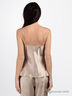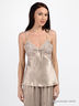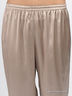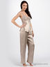 Атласная пижама из топа и брюк. Топ с тонкими регулируемыми бретельками, шифоновыми чашечками и кружевными вставками. Брюки посажены на резинку, прямого покроя.