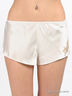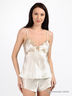 Женская пижама из приятного на ощупь шелка. Топ на тонких регулируемых бретельках и короткие шорты, отделаны изящным кружевом.