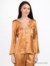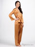 Женская атласная пижама из натурального шелка. Блуза с длинными рукавами, отделана изящным кружевом, на пуговицах. Брюки длинные, прямого покроя. Посажены сверху на резинку и кулиску.