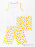 Стильная пижама прямого кроя состоит из двух предметов. Футболка с округлым вырезом горловины без рукавов, полочка украшена принтом, застежка на кнопки. Шорты с эластичной вставкой в поясе.