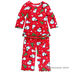 Пижама для детей красного цвета с изображением снеговиков. Вырез горловины круглый. Рукав длинный. Низ изделия и брючины выполнены рюшами.