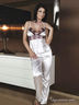 Элегантная пижама выполнена из тонкой атласной ткани, состоит из топа и брюк. Топ под грудью присборен. Тонкие бретели регулируются по длине. Брюки посажены на резинку. Пижама декорирована кружевными вставками с оригинальной вышивкой.