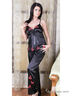Элегантная пижама состоящая из топа и брюк, выполненных из атласной ткани. Топ под грудью присборен, спереди украшение в виде банта из шелковистой ленты. Пижама богато декорирована вышивкой контрастного цвета. Бретели регулируются по длине. Брюки по талии на резинке.
