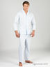 Пижама из натурального хлопка, состоящая из рубашки и брюк. Рубашка застегивается на пуговицы и имеет два кармана, брюки на плотной резинке застегиваются на пуговицу.